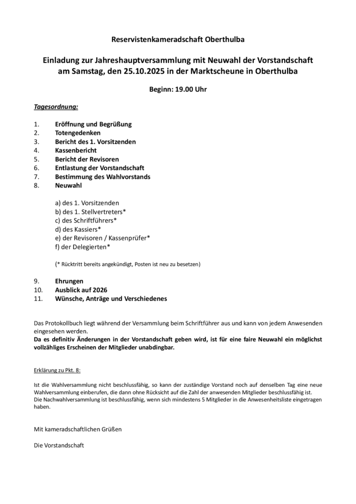 Der Mitgliederstand zur Jahreshauptversammlung am 12.10.2024 beträgt 123 Reservisten.